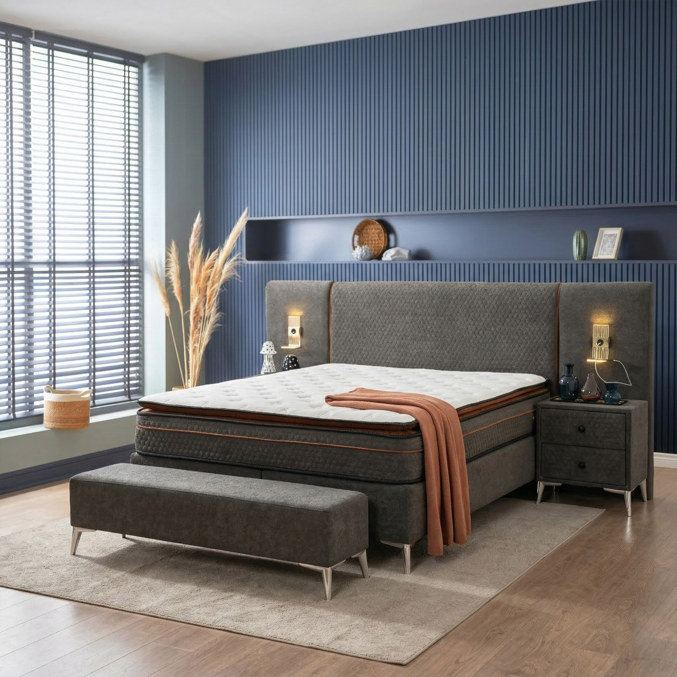 Sade ama karakterli tasarımı, yatak odasında modern ve dengeli bir atmosfer oluştururken; başlık formundaki güçlü çizgiler mekâna şık bir bütünlük kazandırır.