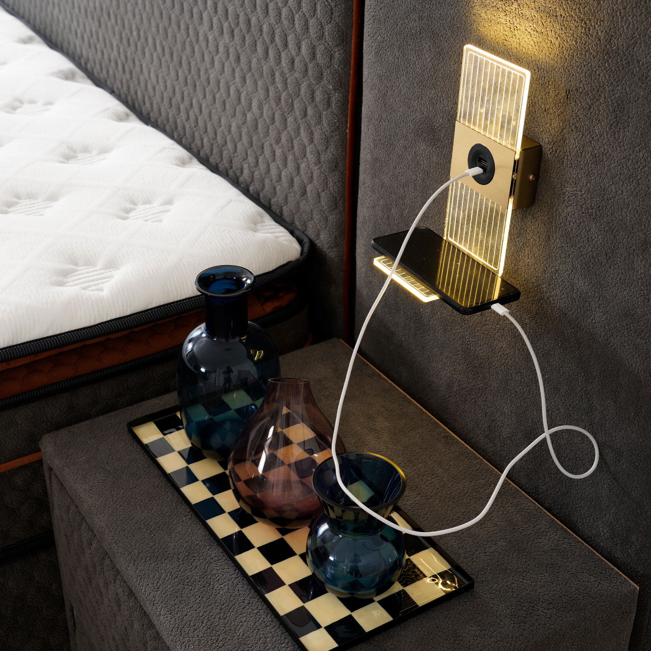 Sade ama karakterli tasarımı, yatak odasında modern ve dengeli bir atmosfer oluştururken; başlık formundaki güçlü çizgiler mekâna şık bir bütünlük kazandırır.
