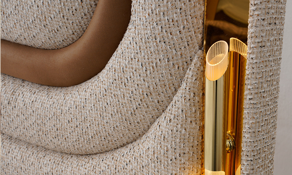Başlık formundaki akıcı hatlar ve sıcak dokular, yatak odasında huzurlu ve sofistike bir atmosfer oluşturur.Dengeli tasarım anlayışı, bulunduğu mekâna sade ama etkileyici bir karakter kazandırırken; kullanılan yumuşak dokular ve ince detaylar konfor hissini estetikle buluşturur